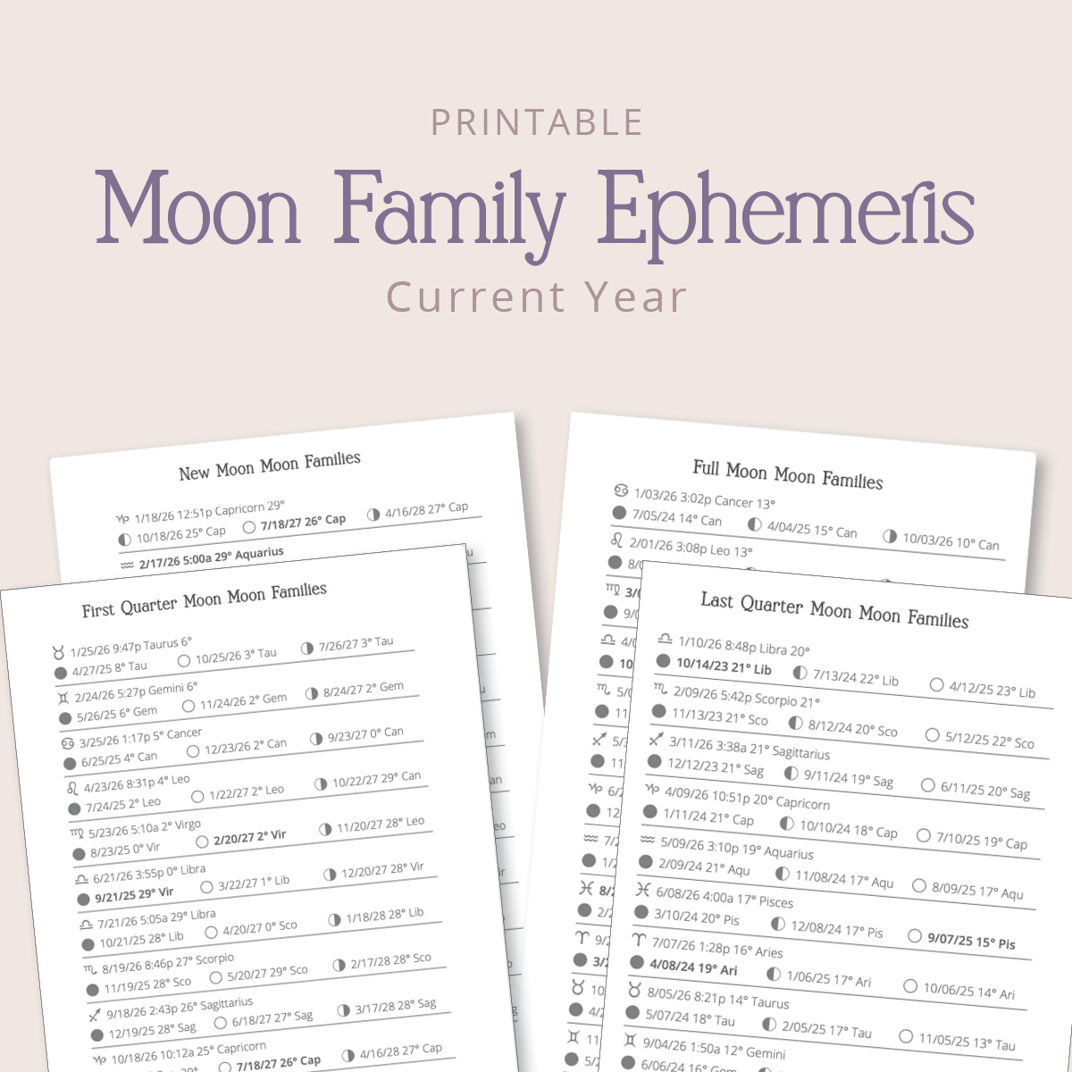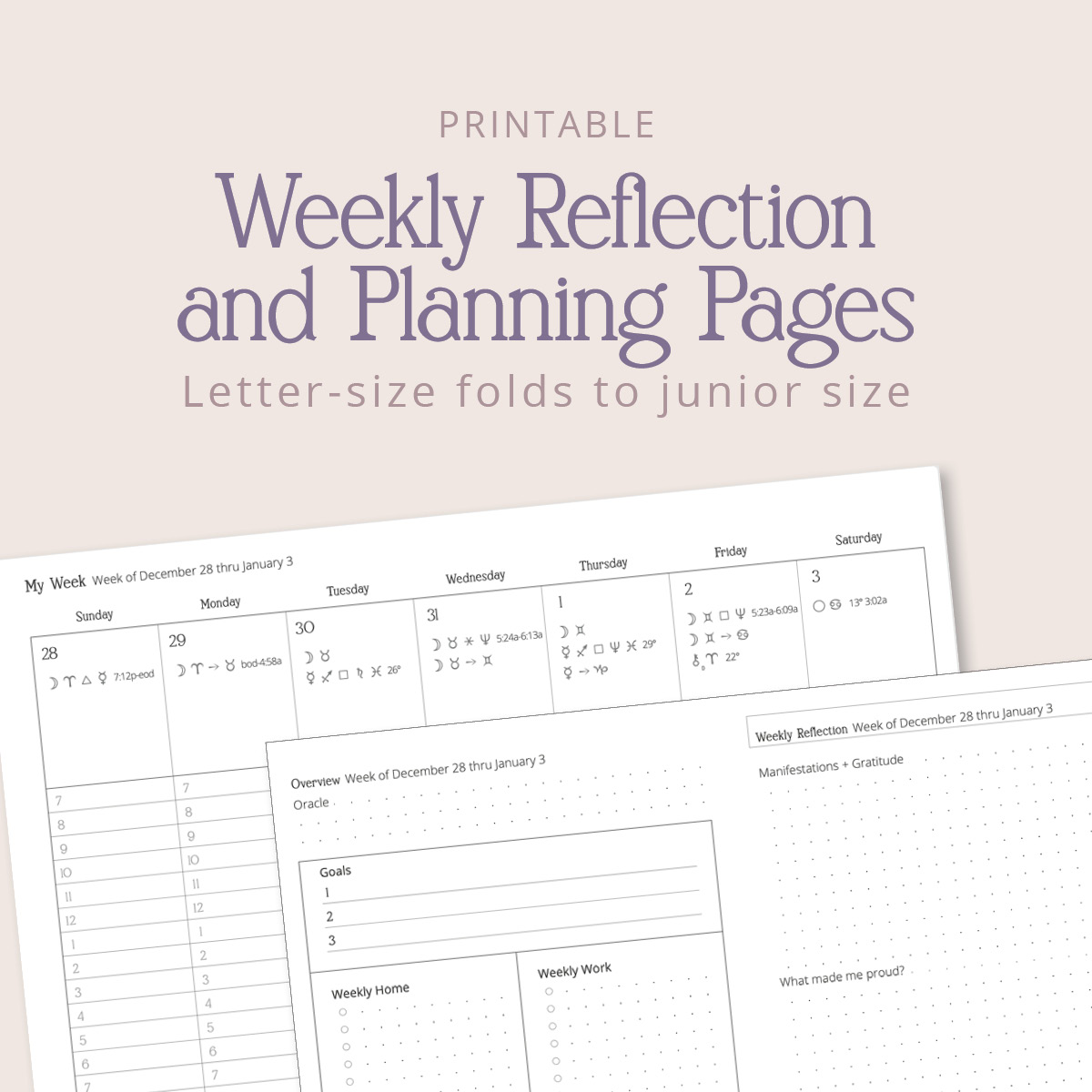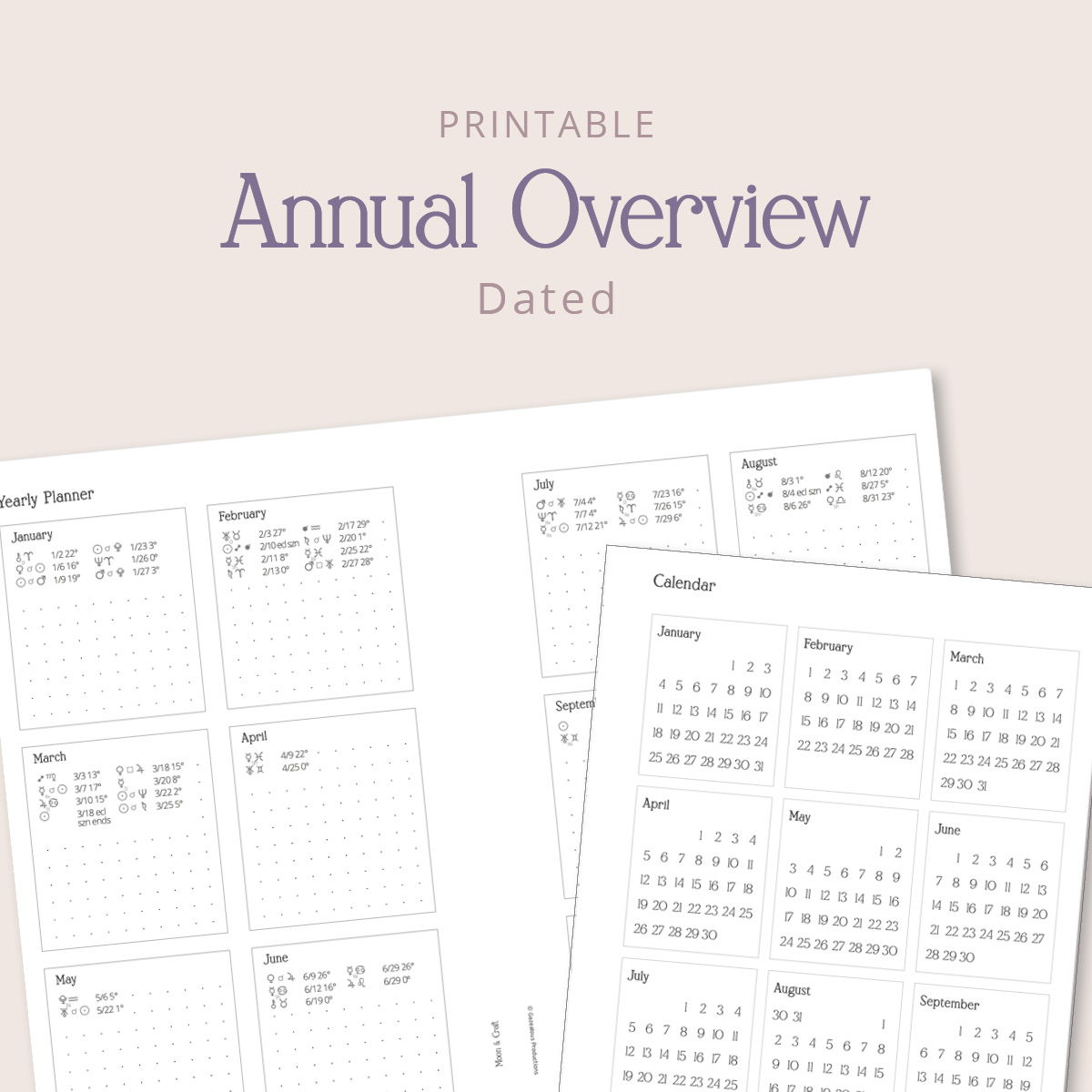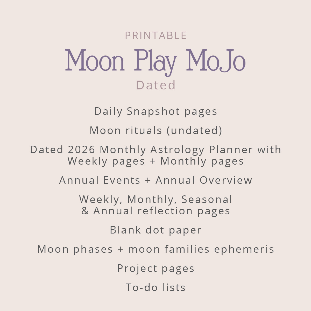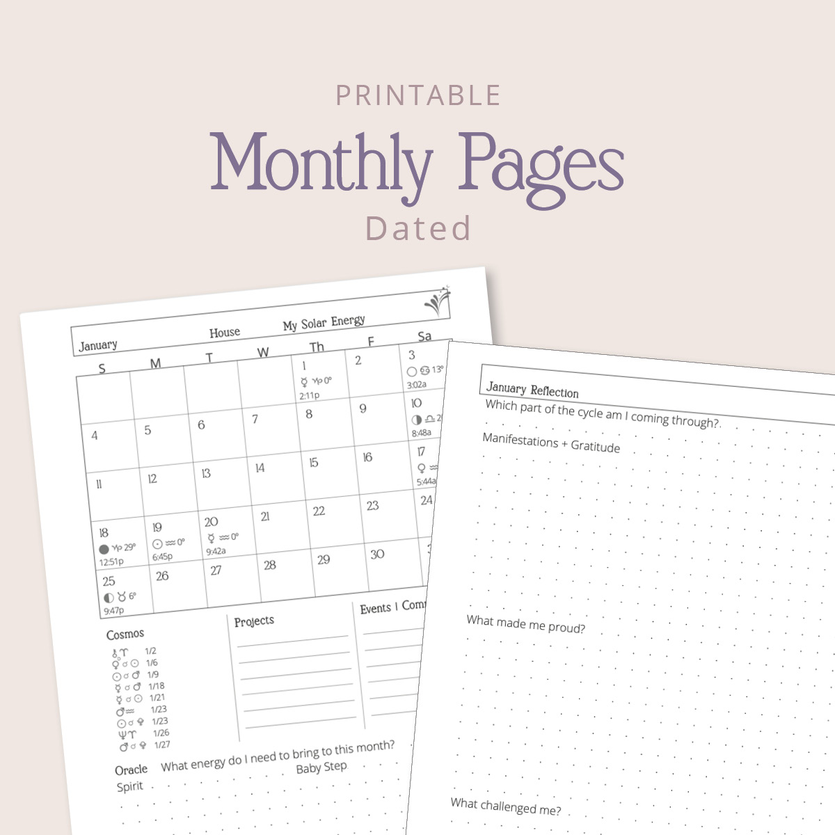 - Dated 2026 Monthly Astrology Planner with Weekly pages (lunar closing aspects, moon voids, Mercury movements) + Monthly pages (moon phases time and degree, solar ingresses, cosmic events highlights)
